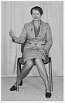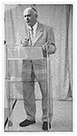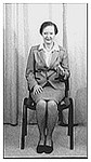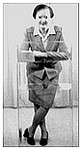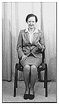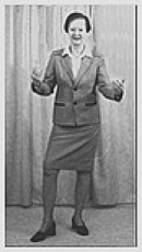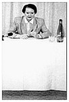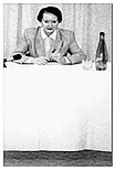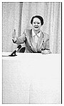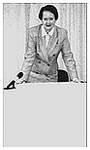 Photo2 : Maintien général rigide. L’oratrice agrippe le micro auquel elle se raccroche (la béquille qui rassure) et derrière lequel elle se cache. Les coudes enserrent le buste comme pour le protéger ( auto contact qui rassure).